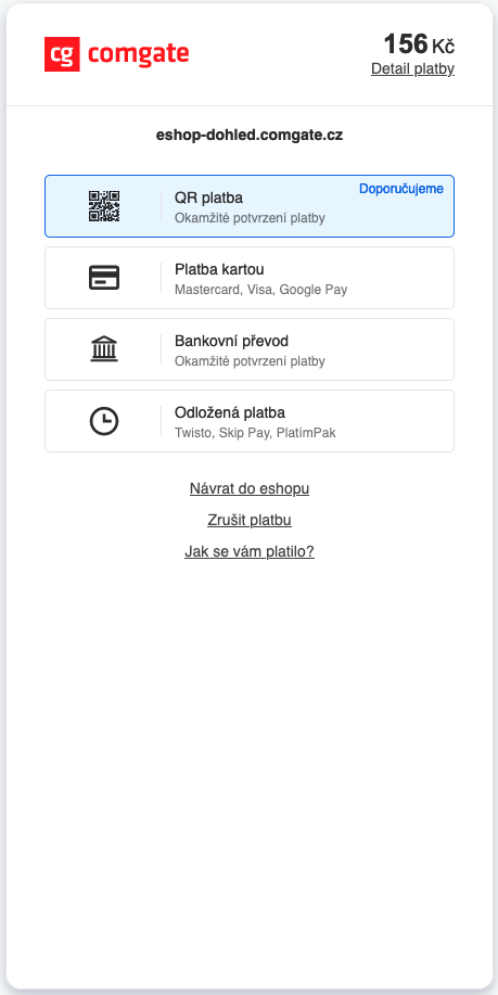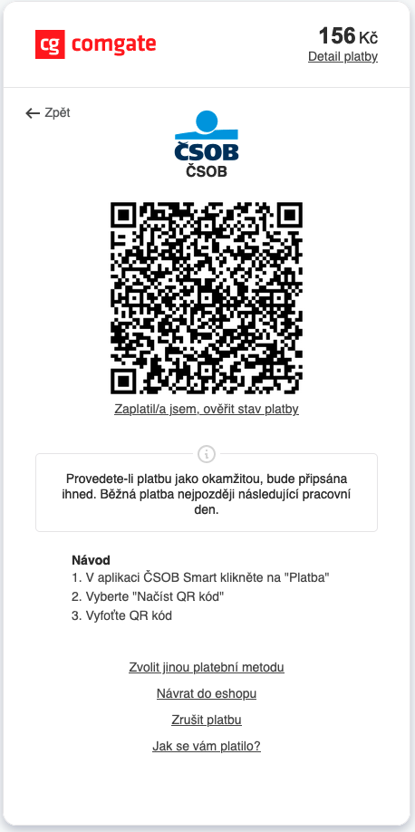 - Po výběru banky má zákazník možnost zaplatit platbu prostřednictvím QR kódu (platí pro české banky), nebo klikne na „Zaplatit v internetovém bankovnictví“ a je přesměrován do internetového bankovnictví.